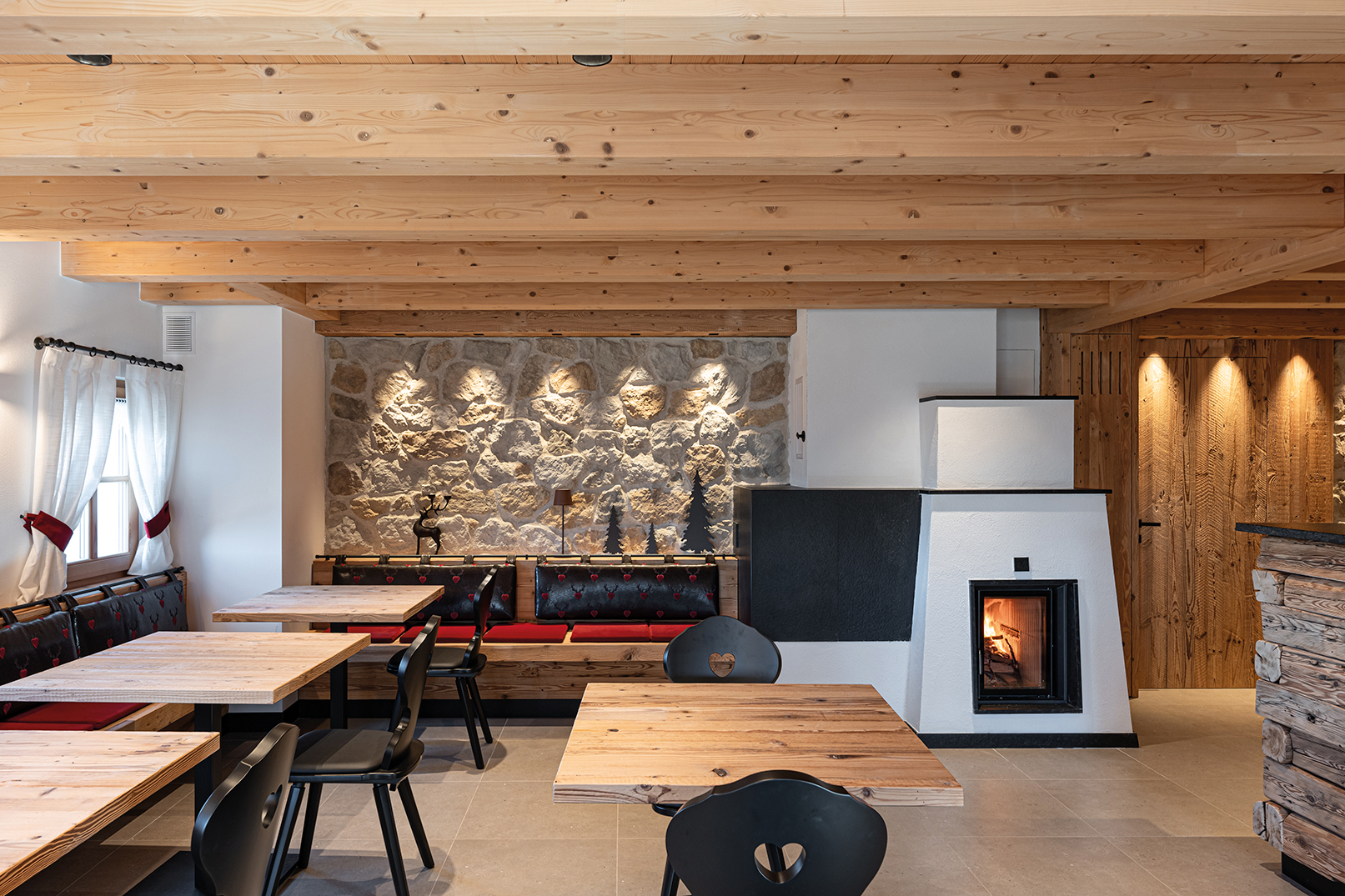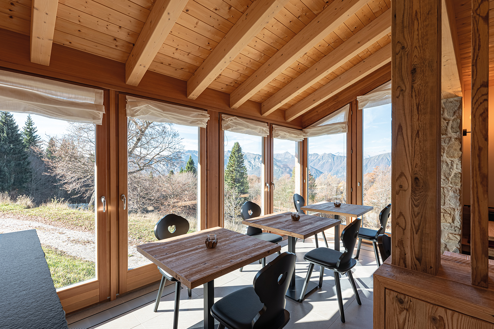 L’intervento sullo storico edificio ottocentesco abbandonato negli anni ’70, su progetto dell’architetto Giovanni Giovanelli, è stato un gesto di riconciliazione con il paesaggio e con la sua memoria. Dopo un primo salvataggio strutturale della parte nord, la vera sfida è iniziata nel 2020: ridare vita alla metà sud in modo coerente, rispettoso, contemporaneo. Per l’interior si è scelto il CLT, il legno strutturale a strati incrociati, per la sua velocità di posa — fondamentale in alta quota — e per le sue qualità intrinseche: calore, traspirabilità e isolamento. Anche l’esterno parla d’identità alpina: la geopietra avvolge, infatti, le superfici con sobria eleganza, richiamando le finiture originali, la malta di calce a raso sasso custodisce il sapore del tempo e, infine, il larice sul prospetto est sussurra la lingua della tradizione. E sopra tutto, silenziosi, i pannelli fotovoltaici: perché oggi abitare la montagna significa, soprattutto, amarla.